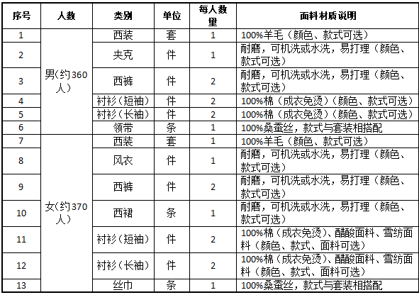 备注:1.需提供质量检测报告;2.制装人数以招标人要求为准,费用不超过预算金额。